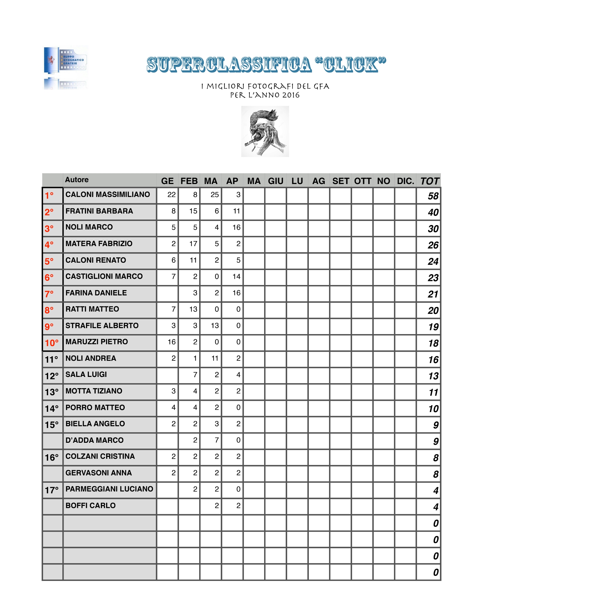 Superclassifica click gruppofotograficoagratese / 7 Maggio 2016 Condividi: Condividi su Facebook (Si apre in una nuova finestra) Facebook Email a link to a friend (Si apre in una nuova finestra) E-mail Stampa (Si apre in una nuova finestra) Stampa Mi piace Caricamento...