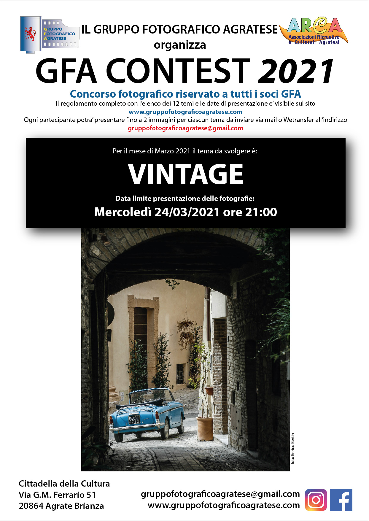 Il tema del contest per il Contest GFA del mese di Marzo 2021 e’ Vintage. Per partecipare le immagini devono prevenire via mail all’indirizzo gruppofotograficoagratese@gmail.com entro le ore 21:00 del giorno 24 Marzo 2021.
