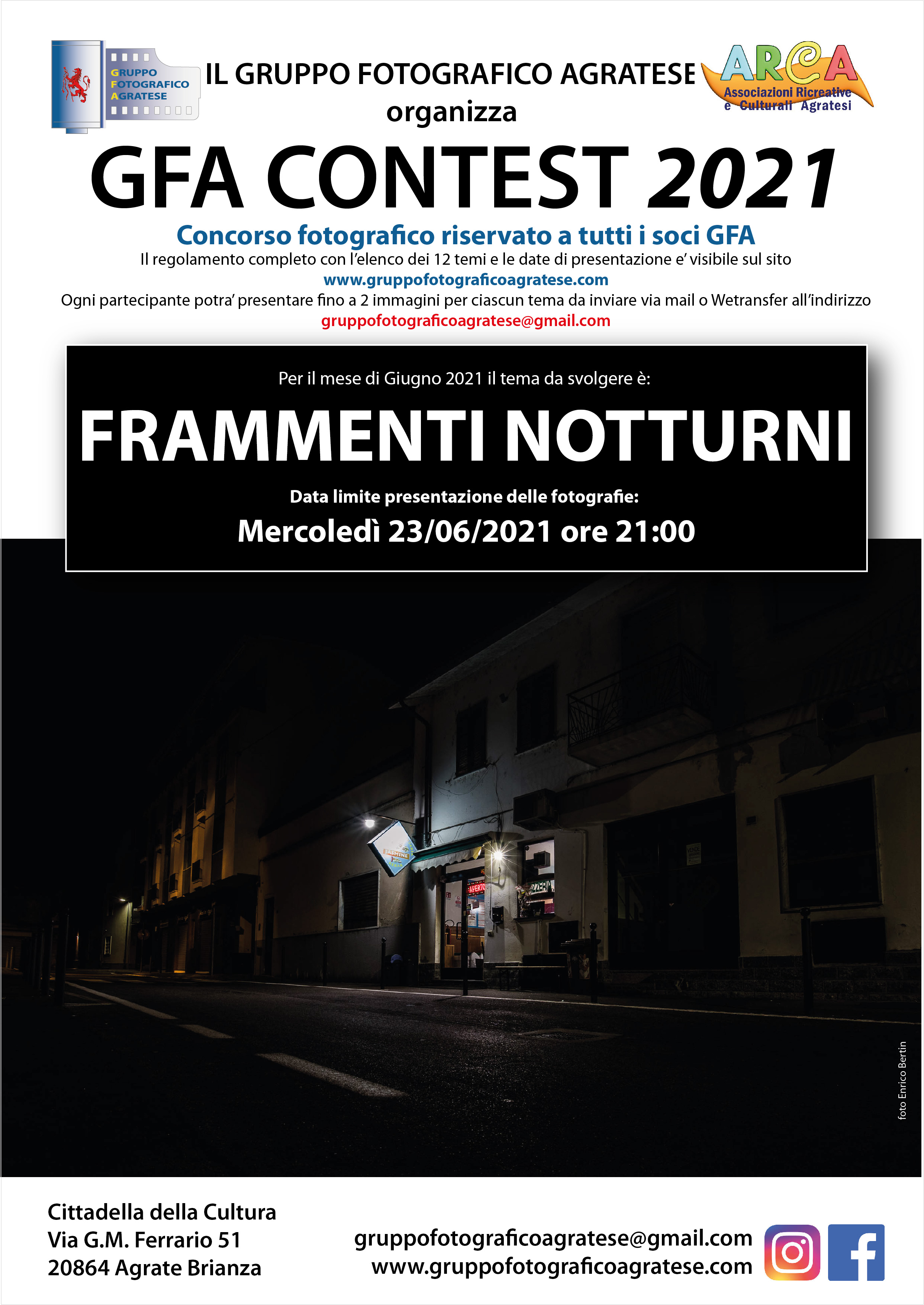 Il tema del contest per il Contest GFA del mese di Giugno 2021 e’ Frammenti Notturni. Per partecipare le immagini devono prevenire via mail all’indirizzo gruppofotograficoagratese@gmail.com entro le ore 21:00 del giorno 23 Giugno 2021. Per ulteriori informazioni e per il regolamento vai alla pagina https://gruppofotograficoagratese.com/gfa-contest-2021-2/