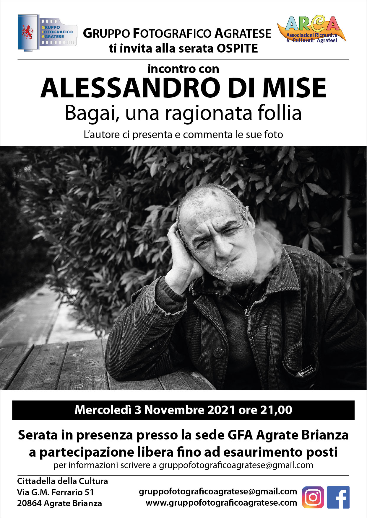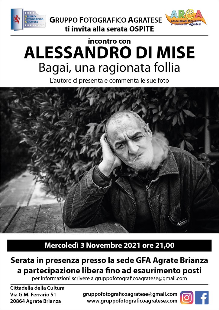 Serata in presenza presso la nostra sede di Agrate Brianza, Mercoledì 3 Novembre ore 21,00, Incontreremo Alessandro Di Mise che ci mostrera’ le sue fotografie. Avremo modo di ascoltare direttamente dalla voce dell’autore spiegazioni e indicazioni delle foto che scorreranno sullo schermo e che Alessandro commentera’ in diretta. Si potra’ quindi liberamente intervenire nella conversazione con l’autore.