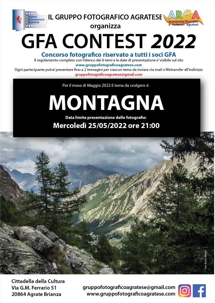 Il termine ultimo per presentare fino a 2 fotografie per ciascun socio e’ Mercoledì 25 Maggio. Come sempre sara’ possibile inviare le immagini in formato JPG all’indirizzo mail del GFA: gruppofotograficoagratese@gmail.com