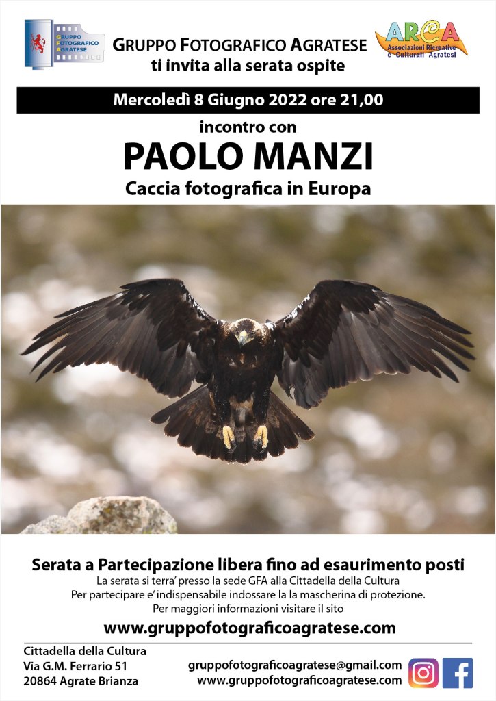 8 Giugno 2022, serata con Paolo Manzi, fotografo naturalista. gruppofotograficoagratese / 7 giugno 2022 Nella serata di Mercoledì 8 Giugno alle ore 21,00 avremo modo di incontrare Paolo Manzi. Fotografo naturalista e live music, ha viaggiato attraversi Italia ed Europa per immortalare alcune tra le specie animali più rappresentative del continente. Condividi: Condividi su Facebook (Si apre in una nuova finestra) Facebook Email a link to a friend (Si apre in una nuova finestra) E-mail Stampa (Si apre in una nuova finestra) Stampa Mi piace Caricamento...
