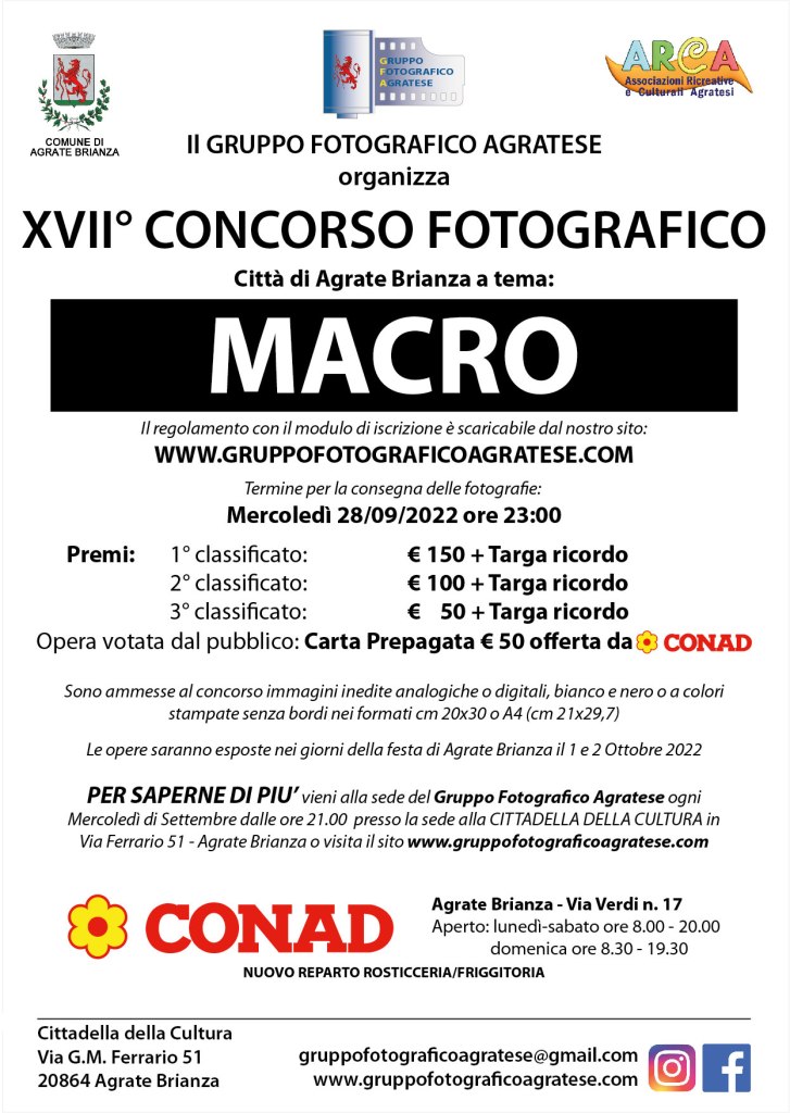 In occasione della festa di Agrate Brianza il Gruppo Fotografico Agratese organizza il tradizionale concorso fotografico aperto a tutti. Il tema scelto quest’anno e’ MACRO. Come sempre ci saranno ricchi premi per i primi 3 classificati oltre al premio assegnato dalla giuria popolare.