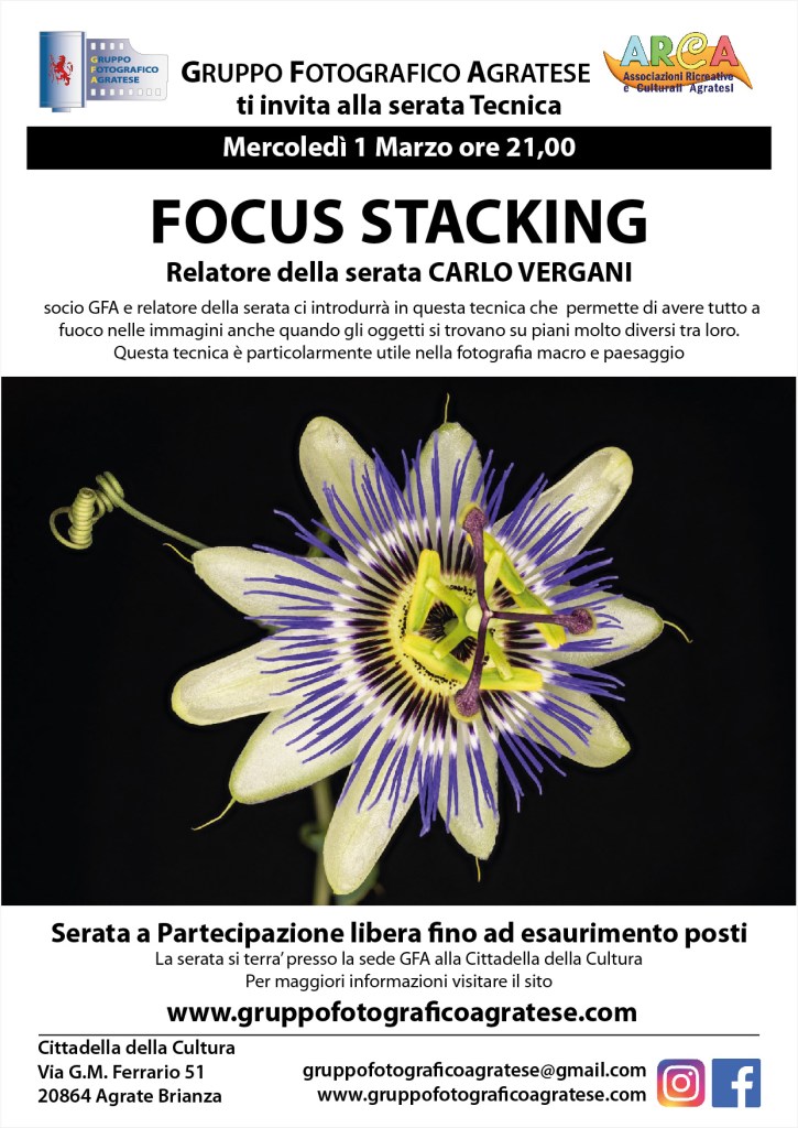 La serata del 1° Marzo e’ dedicata al focus stacking, la tecnica che permette di avere perfettamente a fuoco tutti gli elementi di una fotografia che ci interessano. Questa tecnica e’ particolarmente utilizzata nella fotografia Macro e nella fotografia di Paesaggio.