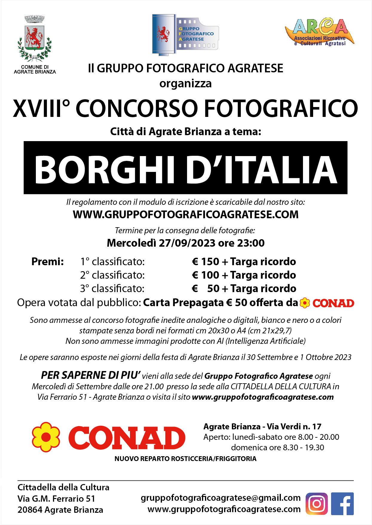 Come da tradizione anche quest’anno il GFA Gruppo Fotografico Agratese organizza il concorso fotografico citta’ di Agrate, aperto a tutti. Le opere dovranno essere consegnate entro il 27 Settembre 2023. In concomitanza con la festa del paese di inizio Ottobre si terra’ la premiazione e la mostra. Quest’anno, per favorire la partecipazione di tutti, e’ stato scelto un tema semplice ma allo stesso tempo molto stimolante e che puo’ lasciare spazio alla fantasia di tutti i partecipanti: Borghi d’Italia. Come di consueto ci sono targhe e premi in denaro per i vincitori. La locandina, il regolamento e il modulo di iscrizione si possono scaricare qui sotto. Si tratta di un concorso fotografico e non saranno ammesse immagini prodotte con intelligenza artificiale.