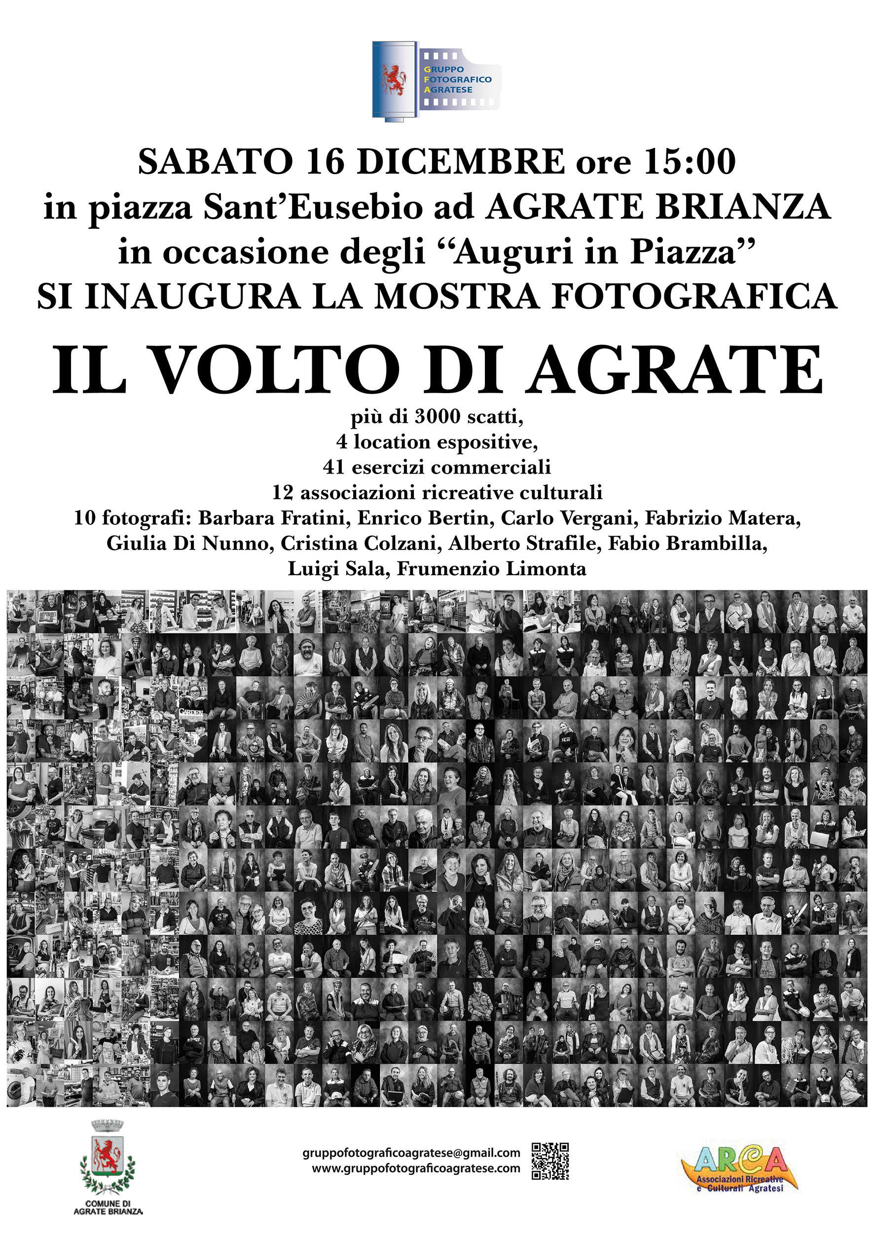 La mostra fotografica che ha impegnato una decina di soci per oltre 10 mesi nel fotografare gli abitanti, i membri delle associazioni, i commercianti di Agrate finalmente e’ pronta e verra’ inaugurata Sabato 16 Dicembre 2023. La mostra sara’ visibile passeggiando per il paese nelle vetrine dei commercianti aderenti, oltre che nel palazzo del comune in piazza Sant’Eusebio, nella Cittadella della Cultura in via Ferrario 51, all’oratorio di Omate , nella nuova piazzetta dei Giardini di Villa d’Adda e nel Polo sanitario di Via Lecco.