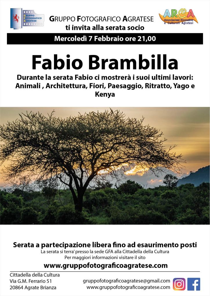 Mercoledì 7 Febbraio Fabio Brambilla ci mostrera’ i suoi lavori gruppofotograficoagratese / 5 febbraio 2024 Mercoledì ore 21, presso la nostra sede siete tutti invitati. Ingresso libero consentito anche per i non soci. Condividi: Condividi su Facebook (Si apre in una nuova finestra) Facebook Email a link to a friend (Si apre in una nuova finestra) E-mail Stampa (Si apre in una nuova finestra) Stampa Mi piace Caricamento...