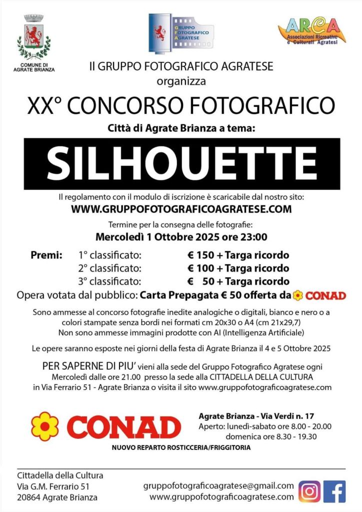 Il titolo per il XX° concorso fotografico citta’ di Agrate Brianza e’ Silhouette gruppofotograficoagratese / 16 Maggio 2025 Scarica e leggi il regolamento con il modulo di iscrizione Pieghevole concorso GFA Agrate 2025Download Condividi: Condividi su Facebook (Si apre in una nuova finestra) Facebook Email a link to a friend (Si apre in una nuova finestra) E-mail Stampa (Si apre in una nuova finestra) Stampa Mi piace Caricamento...